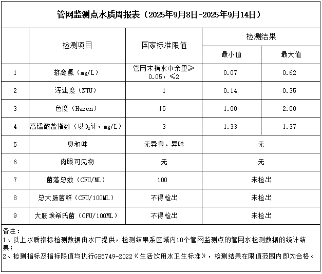 管网监测点水质周报表(2025年9月8日-2025年9月14日)