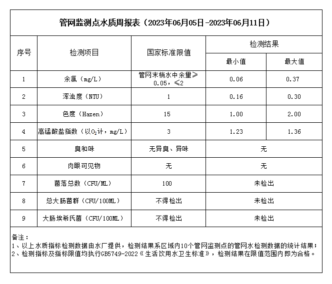 管网监测点水质周报表(2023年06月05日-2023年06月11日)