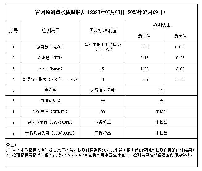 管网监测点水质周报表(2023年07月03日-2023年07月09日)